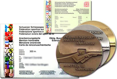 Ab 66 Punkte (Veteranen und Jungschützen 64, Seniorveteranen und Jugendliche 63) wird eine Anerkennungskarte abgegeben. Je 8 Anerkennungskarten des Obligatorischen Bundesprogramms und des Eidgenössischen Feldschiessens (Termine findet ihr in unserem Jahresprogramm) berechtigen zum Bezug der Feldmeisterschaftsmedaille in Bronze, Silber und Gold.